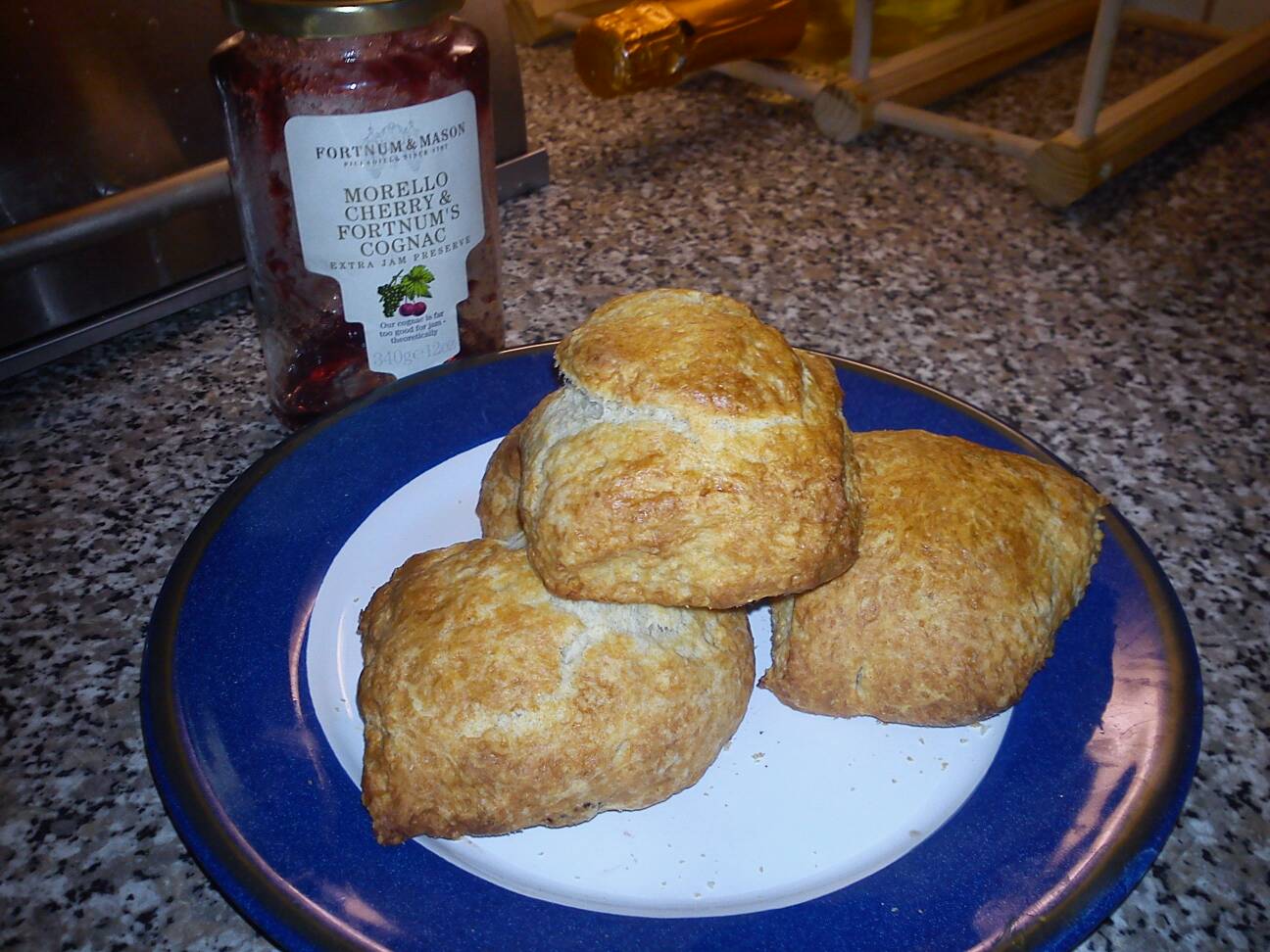 Of course, the real reason for making them is the joy of butter or spread sinking slowly into hot, crusty scones. And to use up the last of the Fortnum and Mason luxury cherry jam from Christmas!